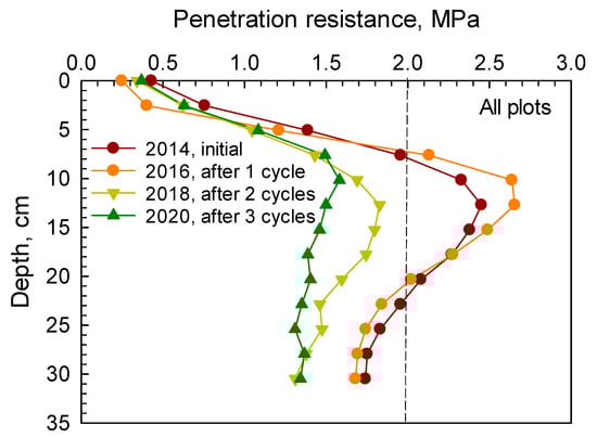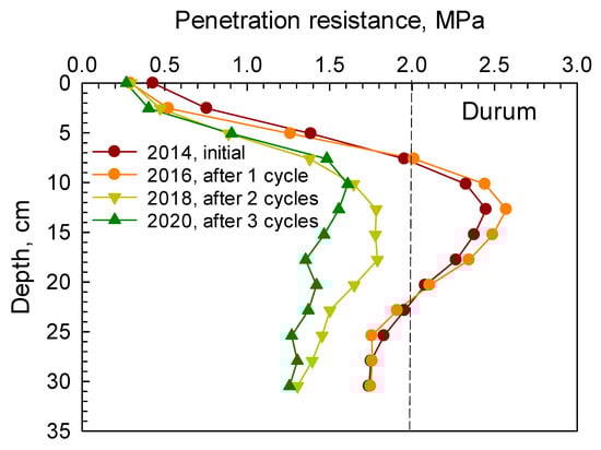 Initial mean soil penetration resistance across all plots in 2014 and after 1 cycle in 2016, after 2 cycles in 2018, and after 3 cycles in 2020 for durum as a previous crop.