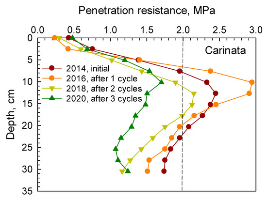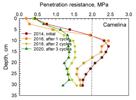 Average soil penetration resistance across camelina, carinata, cover crop mix, and durum plots for the 8–20 cm layer after one, two, and three cycles of the 2 yr rotation were 2.370, 1.678, and 1.521 MPa in 2016, 2018, and 2020, respectively.