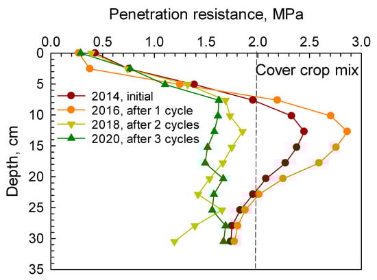 Initial mean soil penetration resistance across all plots in 2014 and after 1 cycle in 2016, after 2 cycles in 2018, and after 3 cycles in 2020 for cover crop mix as a previous crop.