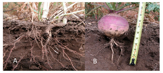 Williams and Weil [15] observed that soybean roots grew through the compacted plow pan soil using channels and “bio-pores” created by decomposition of cover crop roots. Similarly, Chen and Weil [16] evaluated the effect of three cover crop roots in compacted soils. They concluded that forage radish and rapeseed had at least twice as many roots as rye in a highly compacted soil and determined that tap-rooted crops may penetrate the compacted soil layer far better than fibrous-rooted crops.