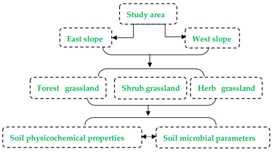 To systematically monitor the impact of vegetation degradation in Guanshan grassland on the microbial biomass and activity of soil, the east slope of the west mountain and the west slope of the east mountain were chosen as experimental locations with similar environmental conditions and similar disturbance from tourism activities to cross-check the credibility of our results. We randomly selected five 2 × 2 m plots of each vegetation type (FG, SG, and HG) for both the east and west slopes, resulting in a total of 30 plots. Within each plot, soil samples were collected from depths of 0–10, 10–20, and 20–30 cm by using a 10 cm inner diameter soil auger on 5 April and 5 July 2017. Each soil sample at a given depth in the FG, SG, and HG sites was composed of five duplicate samples taken at the same soil depth from five plots with the same aspect, and mixed completely as a soil sample. Each mixed soil sample was sieved using a 2 mm mesh and split into two parts. The first part was immediately kept at 4 °C for determining the soil microbial biomass, enzymatic activities, BR, and qCO2, and the other part was air-dried for analyzing the soil physicochemical properties. A detailed schematic diagram of the experimental design is shown in Figure 1.