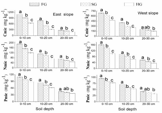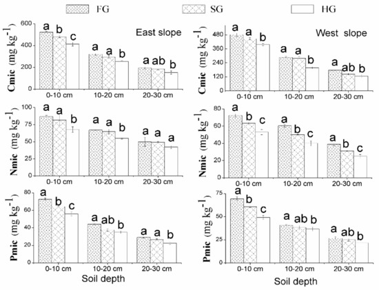 Vegetation types were significantly associated with the soil microbial biomass parameters, such as Cmic, Nmic, and Pmic, in the 0–30 cm soil layers from the east and west slopes (Figure 2). In July, the Cmic, Nmic, and Pmic in FG were obviously greater by 84.7%, 53.7%, and 27.1% from the east slope soil and by 48.6%, 58.3%, and 28.2% from the west slope soil, respectively, than in HG at soil depths of 0–10, 10–20, and 20–30 cm (p < 0.05); correspondingly, the Cmic, Nmic, and Pmic in SG were significantly higher by 56.6%, 37.3%, and 44.3% from the east slope soil and by 43.4%, 34.7%, and 37.6% from the west slope soil relative to HG (Figure 2) (p < 0.05). In April, the Cmic, Nmic, and Pmic in FG were higher than in SG, and in SG were greater than in HG (Figure 3). In both April and July, the Cmic, Nmic, and Pmic in FG and SG were significantly higher than those in HG from the east and west slope soils (Figure 2 and Figure 3) (p < 0.05).