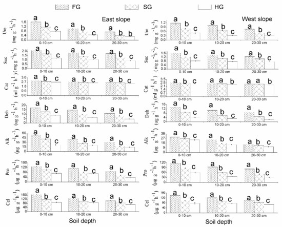 Soil urease (Ure), sucrase (Suc), catalase (Cat), dehydrogenase (Deh), alkaline phosphatase (Alk), protease (Pro), and cellulose (Cel) activities related to vegetation types in July 2017 from the east and west slopes of Guanshan grassland (mean ± SE; n = 5). Significant differences are marked with different lower letters (a, b, and c) at p < 0.05.