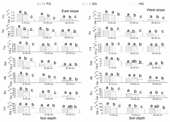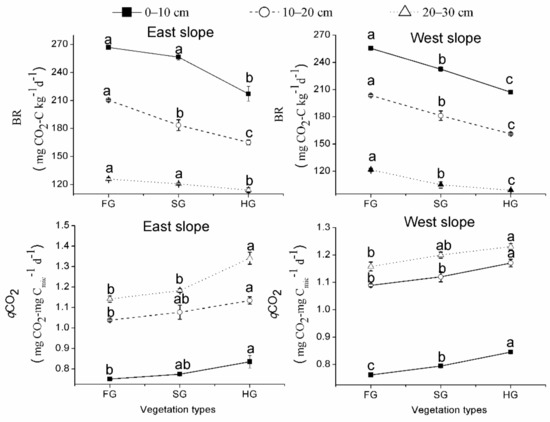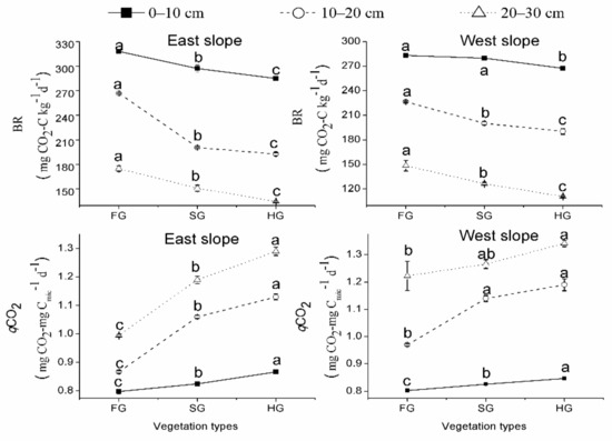 The vegetation types were associated with the enzymatic activities, BR, and qCO2 in the 0–30 cm soil layers from the east and west slopes (Figure 4, Figure 5, Figure 6 and Figure 7). In July, the soil urease, sucrase, catalase, dehydrogenase, alkaline phosphatase, protease, and cellulase activities and the BR in the 0–30 cm soil layers for FG were much greater than for HG by 113.8%, 76.7%, 8.6%, 112.5%, 119.6%, 79.4%, 60.1%, and 24.1% from the east slope, respectively, and by 161.7%, 79.6%, 7.5%, 247.1%, 39.4%, 129.5%, 64.0%, and 15.8% from the west slope (p < 0.05), respectively. The urease, sucrase, catalase, dehydrogenase, alkaline phosphatase, protease, and cellulase activities and the BR at soil depths of 0–30 cm for SG were significantly greater than for HG by 47.2%, 38.6%, 4.4%, 53.1%, 50.0%, 30.6%, 21.6%, and 6.0% from the east slope, respectively, and by 73.8%, 40.8%, 5.7%, 110.7%, 14.2%, 53.6%, 24.8%, and 6.7% from the west slope, respectively (Figure 4 and Figure 6) (p < 0.05). In contrast, the qCO2 in the 0–30 cm soil layers for FG was significantly lower by 19.1% and 11.3% than for HG from the east and west slopes, respectively (Figure 6) (p < 0.05); meanwhile, the qCO2 in SG was obviously lower compared to in HG (p < 0.05) by 6.4% and 4.3% from the east and west slopes, respectively (Figure 6).