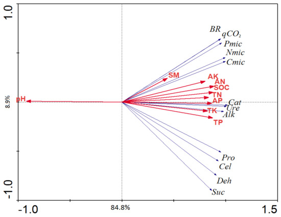 Redundancy analysis (RDA), revealing the relationships between the soil microbial parameters and the physicochemical factors. The soil microbial parameters (Cmic, microbial biomass carbon; Nmic, microbial biomass nitrogen; Pmic, microbial biomass phosphorus; Ure, urease; Suc, sucrase; Cat, catalase; Deh, dehydrogenase; Alk, alkaline phosphatase; Pro, protease; Cel, cellulase; BR, basal respiration; qCO2, metabolic quotient) are illustrated as thin vectors. The soil physicochemical factors (SOC, soil organic carbon; TN, total nitrogen; AN, available nitrogen; TP, total phosphorus; AP, available phosphorus; TK, total potassium; AK, available potassium; SM, soil moisture and pH) are illustrated as thick vectors.