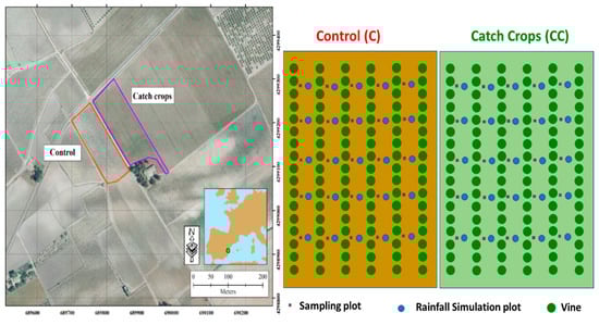 The sampling strategy along the two tested plots is shown in Figure 1. Plant, litter, rock fragment, and bare soil covers were measured before rainfall simulation experiments and were determined by measuring 100 points regularly distributed at each 0.25 m2 plot. Soil samples were collected from 0–2 and 4–6 cm depth as runoff generation and soil losses are highly dependent on the soil surface properties. One sample per plot was collected to determine the biomass of the weed and catch crop cover. A sample was collected for every 0.25 m2 and all the surface plants were sown and transported to the laboratory. Then, they were dried at 60 °C to determine the dry matter. The catch crop was sown on 15 October 2013 and harvested on 15 July 2014. The biomass was surveyed after harvesting 1 m2 close to each plot. The sample was weighed in the field and then dried (60 °C) in the laboratory and weighed again to determine the dry biomass. The calculations allowed us to determine the moisture and dry matter found in the control and catch crop plots.