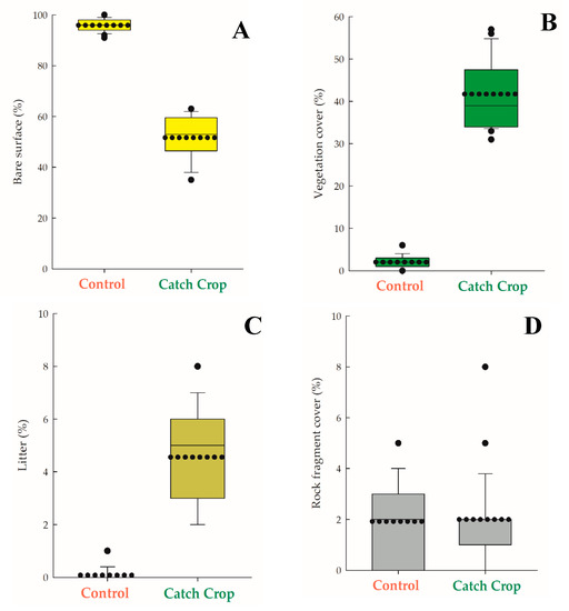 Soil cover characteristics in the control and catch crop (A) plots: vegetation (B), litter (C), and rock fragments cover (D). Continuous line: median values; dotted line: mean values; circles: outliers; 5th and 95th percentiles are also represented per box plot.