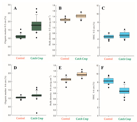 Soil properties at 0–2 and 4–6 cm of soil depth in the control and catch crop plots. SWC: Soil water content. Continuous line: median values; dotted line: mean values; circles: outliers; 5th and 95th percentiles are also represented per box plot. (A) soil organic matter (0–2 cm); (B) soil bulk density (0–2 cm); (C) soil water content (0–2 cm). And (D) soil organic matter (4–6 cm); (E) soil bulk density (4–6 cm); (F) soil water content (4–6 cm).