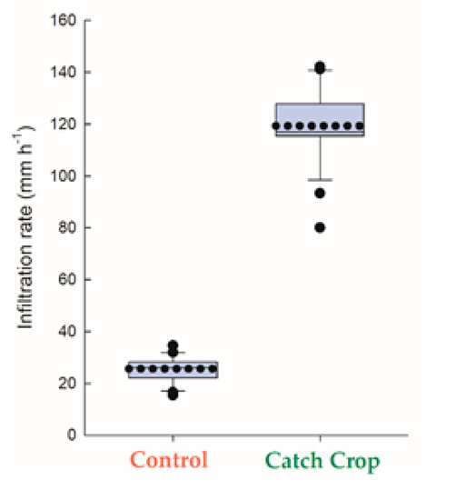 In Figure 5, the steady-state infiltration rates showed that CC enhanced higher infiltration rates with values ranging from 80.05 to 142.2 mm h−1, meanwhile, in the C plots, the values range from 15.38 to 31.91 mm h−1. The average steady-state infiltration rates were 25.53 for C and 119.35 mm h−1 for catch crops. There were statistically significant differences (p < 0.001).