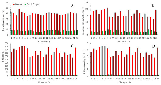Soil erosion results obtained in the control and catch crops plots. (A) runoff coefficient; (B) sediment concentration; (C) soil loss; and, (D) soil erosion.