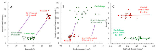 Relationships among variables related to runoff and conditioning factors. (A) Bare soil versus runoff coefficient; (B) fresh biomass versus steady-state infiltration rate; and (C) soil bulk density versus runoff.