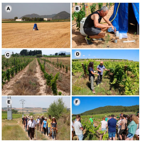 Pago Casa Gran is a lighthouse farm as they produce different agriculture products under organic farming (A), and allow research to be conducted in their farm (B) with the use of catch crops (C) under the supervision of scientists (D); Dr Agata Novara and the Pago Casa Gran technicians) and they complement their management with the visit of scientists, farmers, and students (E,F). (E), show scientists from the different research stations at the Pago Casa Gran (Dr. Ramon Bienes at the forefront to the left in E) and also students such as the ones from the University of Wageningen attending the lecture of Artemi Cerdà, recently.