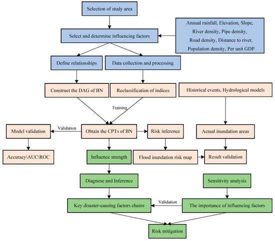 In this study, key disaster-causing factors chains are explored through an urban flood inundation risk assessment model which is established based on BN (Figure 1). The construction of the flood inundation risk assessment model based on BN includes two main parts: structure learning and parameter learning. The specific steps are as follows: (1) Select the study area and analyze its characteristics. According to the experts’ knowledge and relevant literature, the influencing factors of urban flood inundation are identified and presented as the nodes of BN, type and state value of each factors are determined based on the nature of factors. Through field investigation and historical research, the relationships among the influencing factors are determined [41], and they are synthesized to construct the directed acyclic graph (DAG) of BN. (2) The data collection and pre-processing of the study area are carried out (Section 3). Due to the different measurement scales of these data, it is necessary to classify and rescale the factors data. These processed data are imported into the BN structure for parameter training and learning to obtain the conditional probability table (CPT) of each node by using a learning algorithm, such as expectation maximization (EM) [42]. An urban flood inundation risk assessment model is established, and the performance of the model is verified through validation. Then, the established model is used to make causal inference to obtain the probability value of inundation risk of each grid square in the study area, so that the urban flood inundation risk map is drawn by ArcGIS 10.2. Compared with the actual inundation map, the availability and practicability of the model are verified.