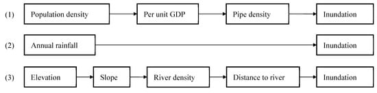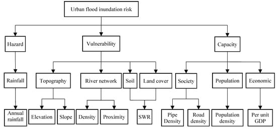 Flooding is considered as one of the most widespread and devastating disasters affecting lives, infrastructures, and society, economy, and local ecosystems, especially in urban areas. In the past few decades, urban flood has become a global challenge, threatening social security, and hindering the development of urban economy [1,2]. With the rapid urbanization and land use change, the frequency and intensity of urban flooding will increase in the future due to climate change and the occurrence of extreme weather events [3]. Generally, flood disaster risk is affected by natural and economic and social factors, such as climate change, land use change, land cover change, poor drainage systems, expansion of impervious area, insufficient infiltration or storage capacity, population explosion, rapid urbanization, and so on. However, these factors are a complex system that interact with each other, directly or indirectly, affecting flood risk. Therefore, it is very important to explore the relationship between factors and how they affect the risk.