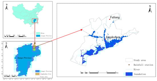 Jingdezhen City is located in the northeast of Jiangxi Province, the transition zone of Yellow Mountain, Huaiyu Mountain and Poyang Lake Plain. Our target study area is the urban area of Jingdezhen (Figure 3), with an area of about 192 km2. The terrain is high around and low in the middle, resembling a basin, thus its being prone to flood with continuous heavy rainfall. The main rivers are the Changjiang River, and its tributaries, Nanhe River and Xihe River. The area predominantly has a mid-subtropical monsoon climate, affected by the climate of the Poyang Lake Basin, the annual distribution of precipitation in Jingdezhen is rather uneven, and the average annual precipitation from April to June accounts for about 46% of the annual precipitation, annual precipitation 1763.5 mm. Jingdezhen is one of the fast-growing cities in the Poyang Lake Basin, the average growth rate of GDP in the past ten years has exceeded 10%. The flood disaster caused by rainstorm is the most devastating natural disaster in Jingdezhen. According to record on June 19, 2016, the affected population is about 528,700, and the direct economic loss is about 1,895.44 million Yuan, accounting for 2.26% of the GDP of that year.