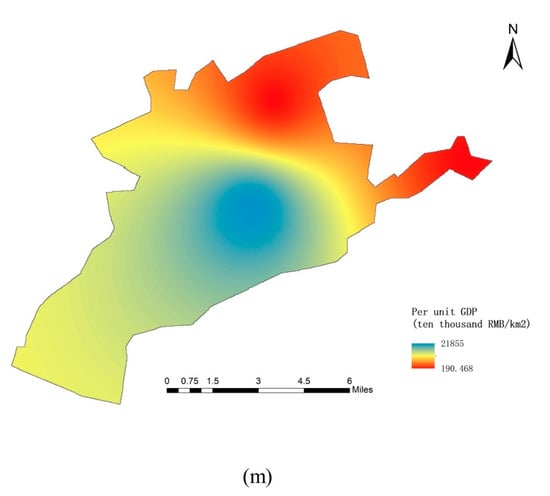 Per unit GDP is also an indicator of resilience and adaptability in different regions. Per unit GDP is a measure of the economic situation of a specific region, reflecting the economic strength of the area. The GDP data are provided by the Jingdezhen Statistical Yearbook and is displayed using by using the inverse distance weighting method ArcGIS (Figure 4m). Economically developed areas are highly adaptable to flood inundation disasters, with low risks, and vice versa.