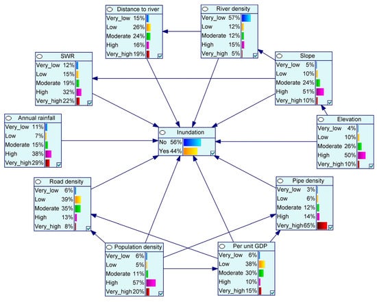 The DAG of BN is synthesized by investigating the study area and referring to the relevant historical literature to select and determine the influencing factors and their relationships. As mentioned in Section 2.2 and Section 3 above, the indicators data of the influencing factors are collected and processed. The whole preprocessed data are randomly separated into 70% (including 23,710 inundation grids and 126,004 non-inundation grids) for training and learning and the other 30% (including 10,162 inundation grids and 54,002 non-inundation grids) for verifying the predictive capability of the model. Then, all data is imported into GeNIe to establish the BN model for urban flood risk assessment (Figure 5) through carrying out EM method. It can be seen that the states of these nodes are represented by bar, and the bars represent the probability of the state, expressed as percentage. For example, referring to the risk classification defined in Table 1, 4% of the “Elevation” is below 30 m, which is represented by the “Very_low” state; “Low” means that the elevation is between 30 and 50 m, with a probability of 10%; “Moderate” indicates that the elevation ranges from 50 to 70 m, and its probability of 26%; “High” means that the elevation ranges from 70 to 90 m, with a probability of 50%, and “Very_high” indicates that the probability of being over 90 m is 10%. The “Inundation” node expresses the probability of flood inundation. Through these probability values, the risk of flood inundation is divided into five levels: Very low, Low, Moderate, High, and Very high.