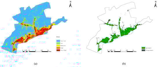 In order to verify the model evaluation results, the high-risk map of the predicted high risk and very high region extracted from Figure 4b is compared with the actual inundation range in the Figure 2 [34]. The matching rate between them is calculated by superposition in ArcGIS, and the matching degree between them is 92.04% (Figure 6b), which conforms basically in reasonable agreement with the actual inundation data. Moreover, through collecting the news and other information about the flood disaster in Jingdezhen City on 8 July 2010, it is found that the inundation locations in the reports is basically consistent with the predicted location of higher inundation probability. For example, Wangwangmiao Community in Changjiang District is seriously affected by flood inundation, and the inundation depth is more than one meter. The inundation probability predicted by the model in this Community is generally greater than 0.8, indicating that the probability of inundation is very high. The example further verifies the research results of the paper. But it should be worth noting that the simulated risk levels are still somewhat different from the actual inundation range. This may be due to the different methods of obtaining the actual inundation areas, or it may be related to the efficiency of the model. The above research results show that the risk predicted by the proposed risk assessment model were in good agreement with the actual flood inundation risk.