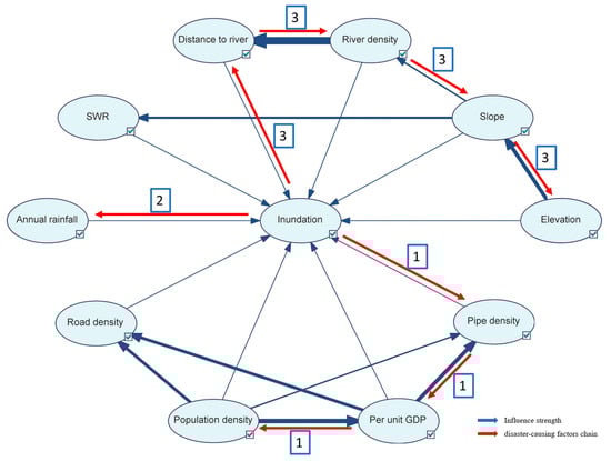 The first three disaster-causing factors chains obtained are considered as key disaster-causing factors chains (Figure 7 and Figure 8), which are, respectively, distributed in three aspects that affect urban flood disasters: hazard, vulnerability, and capacity.