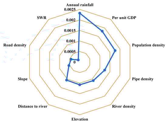 In this study, formulas (2) and (3) are used to calculate the sensitivity value of the nodes in GeNIe (Figure 9). In fact, what is most interesting is the order of importance of the influencing factors to the results. The results show that annual rainfall has the greatest impact on flood inundation. Except for road density, in the terms of the order of importance, hazard factor have the greatest impact on inundation, followed by the capacity factors and, finally, the vulnerability factors.