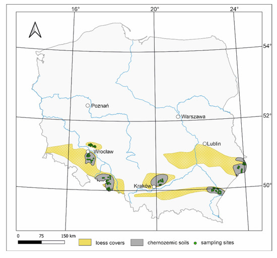 The study focused on the Chernozems and related soils developed from loess, having a similar texture of silt loam. Samples were collected from arable fields, forests and grasslands existing under the same land use for a long time (at least since the beginning of the 20th century) that is checked on available topographical maps [19]. The sampling sites were located in the patches of Chernozems preserved in the loess belt of South Poland (Wrocław Plain, Głubczyce Plateau, Miechów Upland, Hrubieszów Basin and Przemyśl Foothills) (Figure 1). However, field inspection during the sampling has revealed a deep leaching of carbonates or a lack of mollic/chernic horizons in some profiles respective to the present temperate climate [23] or history of occupation and land use [24]. Therefore, some soils did not fulfil the criteria of Chernozems in terms of World Reference Base (WRB) classification [25] and were classified as Phaeozems or Luvisols, in line with recent reports [26,27,28].