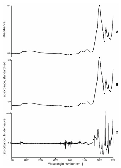 Two-step mathematical pretreatment [19,33] was performed (Unscrambler 10.4 software, Norway) to maximize the differentiation between the target groups of samples. First, the spectra were standardized to zero mean and variance = 1 (Figure 2B) to reduce the influence of organic matter quantity and the size of particles on the final spectral image. Then, the first derivative was applied (Figure 2C), which, as expected, increased the quantity of information from functional groups of organic compounds.