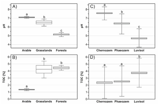Although all soils under study were developed from similar parent material (loess) and presumably had a similar primary chernozemic origin, presently they differ in their physicochemical properties, mainly depending on land management. Arable soil had the highest, whereas forest soils—the lowest pH values, ca. 7 and 5, respectively (Figure 3A). Contrastingly, the SOC content was significantly higher in the forest and grassland than in arable soils, with average values ca. 4.3% and 1.3%, respectively (Figure 3B). Among the dominant soil types (i.e., reference soil groups in terms of WRB classification), the topsoil samples of Luvisols were acid, whereas the topsoil samples of Chernozems and Phaeozems were neutral or alkaline, with mean pH values of ca. 4.6 and 7.5, respectively (Figure 3C). The SOC content was less differentiated, but the mean SOC values in Luvisols, ca. 3.7%, were significantly higher than the mean SOC in Chernozems and Phaeozems, ca. 2.1–2.5% (Figure 3D).