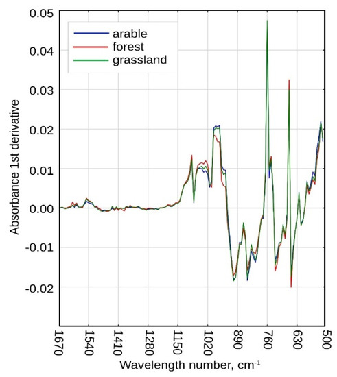 The MIR spectra (standardized, first derivative) averaged for the distinguished land-use classes clearly differed in intensity and width of characteristic bands, in particular in the Section 900–1100 cm−1 (Figure 4). These differences have variable scales for particular bands and their individual analysis does not reflect, neither quantitatively nor qualitatively, the mutual relationship between classes. In contrast, the canonical variate analysis yielded a clear differentiation, without mutual overlapping, of the soil samples into classes according to land use (Figure 5).