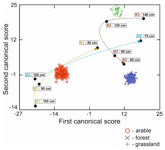 The Mahalanobis distances, used for quantification of the discrimination, exceeded the high values of 20–25 (Table 1). These high values related typically to one of two canonical variables, whereas they were much lower in relation to the other one (Table 1). Only the discrimination between arable and grassland soils was similarly strong in relation to both canonical variates (Table 1). The scores of the samples from buried humus horizons (where the land use of soil before the burial was unknown) were, in general, in the same range as those of surface soils but not always within the space between the land-use classes (Figure 5). However, the depth-related trends may be distinguished from an arrangement of the particular samples. In kurgans K2 and K3, the signal from the forest became stronger towards the buried soil surface. In kurgan K3, samples collected at a lower depth (115–140 cm) were placed closer to the grassland class, whereas in kurgan K2 the signal indicated arable lands. In both cases, the samples from a depth of 60–80 cm were located closer to the forest class. The score from the topsoil sample of buried soil in kurgan K1 was placed apparently in the center of the space between all three classes, indicating the relation to variable vegetation connected with these land-use forms.