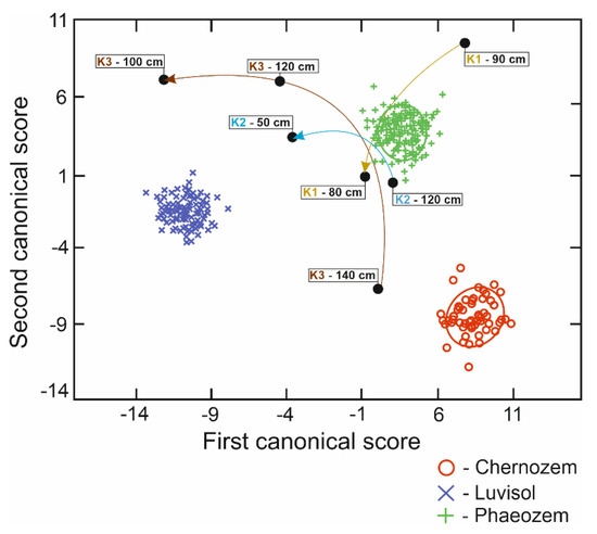 The MIR spectra analyzed in relation to the recognized soil type (reference soil group in terms of WRB classification) yielded three well-discriminated classes (Chernozems, Phaeozems and Luvisols), which suggested the possibility of a direct reconstruction of the transformation trends in the buried soils (Figure 5). The canonical scores of some soil samples did not fit the “space” created by the abovementioned three classes. This result suggests possible influences from the other physicochemical soil components important for pedogenic processes, such as carbonates and clay minerals [39]. However, the placement of some samples indicated the soil transformation (analyzed as the change from the bottom towards topsoil layers of the buried soil) from Chernozem through Phaeozem towards Luvisol (kurgan K3) and from Phaeozem towards Luvisol (kurgans K1 and K2), which is consistent with opinions regarding the transformations of chernozemic soils during the Holocene period [19,29,40,41]. Clear discrimination of the topsoil horizons of modern soils into non-overlapping classes referring to the land use and soil type has confirmed the potential of non-destructive spectroscopic methods in paleopedological studies. Unfortunately, the samples tested in the present research were obtained from three already available buried profiles; therefore, the presented findings are single case studies, and a larger number of buried soils must be investigated to draw more general conclusions.