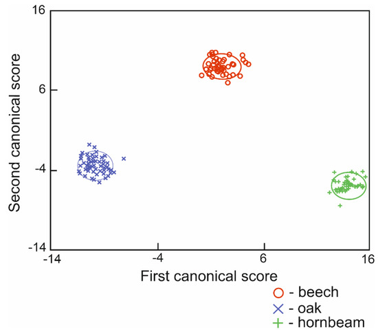 The canonical variate analysis applied to discriminate the samples among the classes related to soil type (reference soil group, i.e., Chernozems, Phaeozems and Luvisols) yielded a differentiation without mutual class overlapping but less prominent as compared to land-use classes (Figure 6). The Mahalanobis distances reached values of 13–19 between Chernozems/Phaeozems and Luvisols (according to the 1st variate), whereas the distances according to the 2nd variate were much lower (Table 1). The scores of the samples from buried humus horizons in the K3 kurgan indicated a poorly marked depth-related trend (i.e., samples from a lower depth are located closer to the Chernozem class, whereas samples from a shallower depth are located closer to the Phaeozem or Luvisols group). The sample from the deeper sub-layer of the buried humus horizon in kurgan K1 was close to Phaeozems, and the sample from an overlying sublayer was placed between Phaeozems and Luvisols. In general, the samples from soils buried under kurgans rarely had scores indicating their adjacency to Chernozems (Figure 6). Furthermore, the canonical variate analysis was applied to discriminate the samples of forest soils in relation to dominant forest vegetation. Even if the broadleaf forests under study had mixed species composition, the three classes were clearly differentiated (i.e., beech-, oak- and hornbeam-/maple-/lime-dominated stands (Figure 7). The 1st variate strongly discriminated between oak- and hornbeam-dominated forests (with the Mahalanobis distance reaching a value of 24, Table 1), whereas the 2nd variate clearly discriminated samples from beech-dominated forests from the other broadleaf stands (Mahalanobis distances of 12–15). Although the majority of buried soils under study did not indicate their adjacency to the forest class, a clear discrimination into classes related to species composition was not possible. However, the connection of buried soil’s organic matter with forest vegetation is not excluded, and further investigation on this field may require a larger set of data from burial profiles.