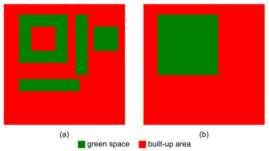 A growing number of studies have investigated the impact of urbanization and LULC change on ES. These studies reveal that a decrease in green spaces affects ES, feeding the perception that there is a positive relationship between the surface area of green spaces and urban ecosystem functioning [4,32]. However, these studies generally ignore the impact of spatial heterogeneity of the land surfaces as they lump together the area of each land-use type. Only a few of them acknowledged the differences in landscape patterns but still did not consider landscape patterns in calculating the impact of green spaces. As a result, an area of green spaces, as shown in Figure 1, could still be perceived as a lumped area instead of a distributed area, where the green space units have different landscape patterns, such as connectivity, aggregation, mean patch size, and large patch index, which could affect ecosystem services [33,34].