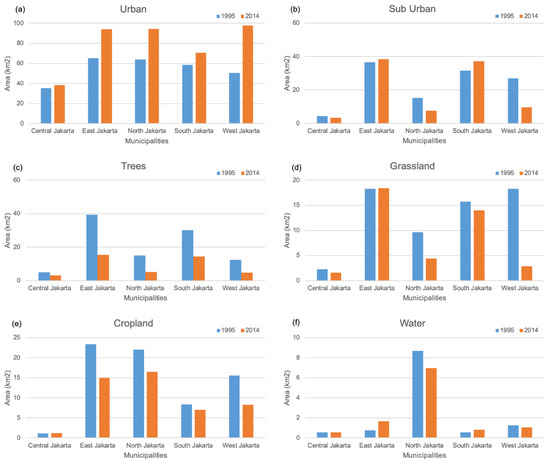 The LULC change in the study was analyzed by focusing on the spatial extension of the urban areas and the decrease in vegetative cover and bodies of water from 1995 to 2014, as shown in Figure 4. In 1995, the spatial distribution of urban areas was concentrated in three municipalities, which were East Jakarta (65.3 km2), followed by North Jakarta (63.9 km2) and South Jakarta (58.5 km2). On the other hand, the smallest urban area was about 35.4 km2, which was observed in Central Jakarta. After 20 years, urban areas increased in all municipalities. The largest urban area in 2014 was about 97.8 km2 in West Jakarta, which increased by about 93.7% from that in 1995. Meanwhile, urban areas in East Jakarta and North Jakarta increased by almost a half from that in 1995. On the other hand, the smallest urban area, by approximately 38.4 km2, was identified in Central Jakarta, which increased by 8.2%.