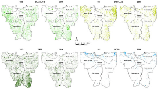 The dynamic changes of the built-up areas affected the area of green spaces, where trees were by far the most affected, followed by grassland and cropland, as shown in Figure 4 and Figure 5. In 1995, trees were mainly distributed in East Jakarta and South Jakarta, where the area of trees was more than two times of that in the other municipalities, such as in North Jakarta and West Jakarta. The largest area of trees (39.4 km2) was observed in East Jakarta, while the smallest area of 5.0 km2 was in Central Jakarta. In 2014, the area of trees decreased above the average in all municipalities except in South Jakarta and Central Jakarta. A significant decrease of 65.8% was observed in North Jakarta, followed by West Jakarta (−62.2%) and East Jakarta (−61.1%). However, the area of trees in that area was still higher than that in other municipalities. For instance, East Jakarta had the largest area of trees (15.4 km2), which was higher than 14.5 km2 in South Jakarta. On the other hand, the smallest area of trees (3.2 km2) was detected in Central Jakarta.