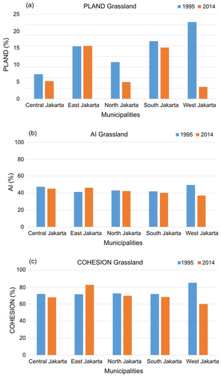 Meanwhile, the dominant proportion of the urban areas also influenced the landscape patterns of the grassland, as shown in Figure 7. In 1995, the highest proportion of grassland was about 14.5% in West Jakarta, followed by South Jakarta (10.9%) and East Jakarta (9.9%). The proportion of grassland in West Jakarta was found higher than the proportion of trees in the same year, which showed a different green space pattern in a municipality. Meanwhile, the low AI percentage indicated that grassland had dispersed distribution in all municipalities. The connectivity of grassland in 1995 was almost similar in four municipalities where the connectivity varied from 71.4% to 72.4%. The highest connectivity of grassland was observed in West Jakarta, where COHESION was 84.9%.