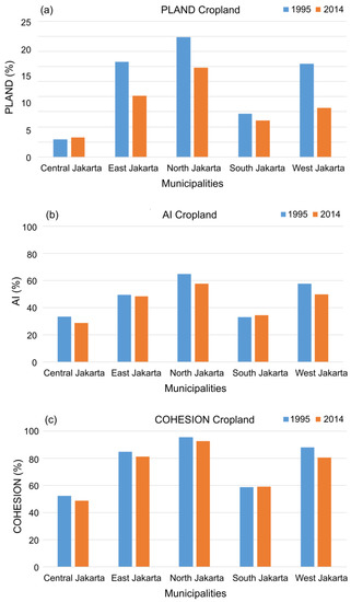 Moreover, the landscape patterns of cropland were also subject to dynamic changes due to urbanization, as shown in Figure 8. In 1995, the highest proportion of cropland was mainly observed in North Jakarta, East Jakarta, and West Jakarta. The highest cropland proportion of 15.9% was observed in North Jakarta, while the lowest cropland proportion of 2.3% was observed in Central Jakarta. Meanwhile, the cropland distribution in the four municipalities exhibited a scattered pattern, as indicated by the AI percentage. For instance, cropland in Central Jakarta, East Jakarta, and South Jakarta was below 50%. Moreover, the connectivity of crops was high in North Jakarta, West Jakarta, and East Jakarta, where the COHESION was 95.3, 87.9, and 84.6%, respectively.