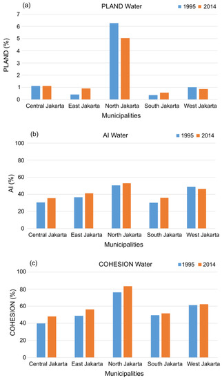 In contrast with the landscape patterns of green spaces, urbanization did not have a significant impact on the landscape patterns of bodies of water, as depicted in Figure 9. The proportion of bodies of water in 2014 was similar to that in 1995. The dynamic changes of the landscape patterns of bodies of water were marked by a small increase in the proportion of bodies of water in East Jakarta and South Jakarta, while this proportion decreased in North Jakarta and West Jakarta. However, the aggregation and the connectivity of bodies of water increased in all municipalities in 2014, as shown in Figure 9.