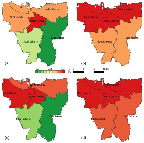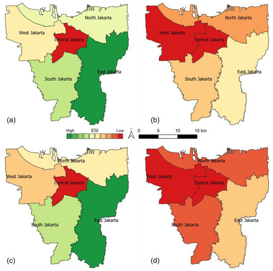 In this study, ES changes analysis was limited to carbon sequestration, temperature regulation, and runoff regulation, due to the limitation of the medium resolution satellite images to capture several urban details, such as street corridors and small city parks. Furthermore, in the ES selection increasing carbon emissions [64,65], and recent climate-related hazard events in Jakarta, such as urban flooding in 2013, 2014, 2015, and 2020, have also been considered [66,67], as well as the potential increase in the urban temperature [37,68]. The ES estimation adopted a weighting factor used in [9], where the green space with high-temperature regulation capacity was given a weight of 1.0, whereas 0.5 was given for low capacity. In this study, the weighting factor was implemented for all ES estimations for which the factor was given on the basis of the importance of a particular green space to a particular ES. For example, grassland was given the weight of 0.5 for temperature regulation, but it was given 1.0 of the weight factors for runoff regulation.