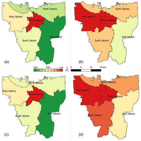 Ecosystem services index (ESI) for temperature regulation in the year 1995 and 2014. (a) ESI in 1995 without landscape metric area (LMA); (b) ESI in 2014 without LMA; (c) ESI in 1995 with LMA; and (d) ESI in 2014 with LMA.