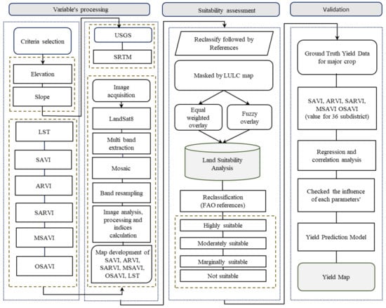 It is worth mentioning that quick and accurate land suitability assessments can aid in the improvement of yield prediction models. Regarding the judgment of the prediction of yield using vegetation indices (VIs), it is the most straightforward approach to establishing empirical relationships between ground-based yield measures and Vis [13,14,15]. In this regard, satellite remote sensing technologies and GIS applications for monitoring crops have the potential to establish timely assessments of changes in the growth and development of crops on regional scales [16]. The yield prediction is also helpful for making decisions on regional food security policies and production inventories to understand the availability of field crop.
