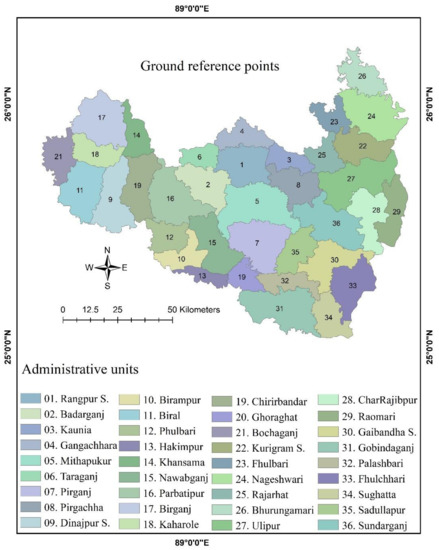 The study area is located between 25°14′ and 26°02′ N latitudes and 88°22′ and 89°54′ E longitudes in the northern part of Bangladesh and has a total area of 8260 square kilometers. The study was conducted in the Dinajpur, Rangpur, Kurigram, and Gaibandha districts of the Rangpur Division where the inhabitants derive their livelihoods from agriculture (Figure 2). The area consists of 36 administrative units with an overall population of 11,498,000 [18]. The population is economically active in agriculture; nevertheless, agronomic land use is highly inconsistent due to climatic factors, soil property issues, water infiltration, environmental resources, and local socioeconomic conditions. Based on weather data, the minimum and maximum mean annual temperature varies between 8.47 °C and 36.3 °C. The annual average rainfall recorded is 7650–1233 mm, with a high humidity in the range of 41–77% [19]. The elevation ranges from 5 to 30 m above sea level.