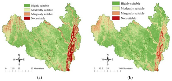 Suitable classes of land suitability analysis using soil specified remote sensing data. (a) Equal weighted overlay. (b) Fuzzy overlay.
