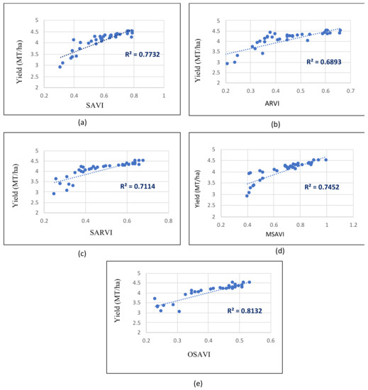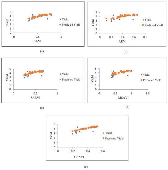 The performances of the yield prediction models were examined by field data. After the correlations among the five selected vegetation indices were established, the yield map was developed. Simple and multiple regression analyses were carried out between the mean values of the vegetation indices and the ground referenced data of the dry season irrigated rice to determine the best-fitted models for rice production. These data were classified to evaluate the production that occurred between 2017 and 2020. The SAVI, ARVI, SARVI, MSAVI, and OSAVI values were aggregated into a time series pattern (Appendix A). The yield data were compared through regression. The five vegetation index values were collected from reference points in the 36 subdistricts. Ground truth data information was obtained from the 36 subdistricts, and the yield was reported in metric tons per hector (MT/ha).
