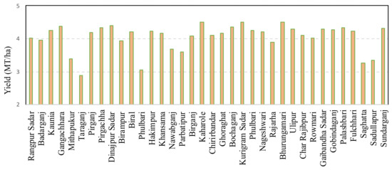 The detected fertile zone was verified by ground reference data. The time series datasets played a vital role in developing and validating the yield prediction models. In Bangladesh, nearly 80% of the total land is allocated solely to rice cultivation [62]. Additionally, in the northwestern part of the country, approximately 70% [63,64,65] of the land is cultivated with dry season irrigated rice (boro rice). To facilitate further analysis, the major rice crop was carefully chosen for approval. The suitable area was verified by ground truth yield data. The yield data of dry season irrigated rice were collected from the Department of Agricultural Extension (DAE), Ministry of Agriculture, Bangladesh, for the 36 subdistricts in 2017–2020 to evaluate the accuracy of the land suitability analysis (Figure 4 and Figure 5). After preparing the data in Microsoft Excel, the correlations among the five selected indices were evaluated.