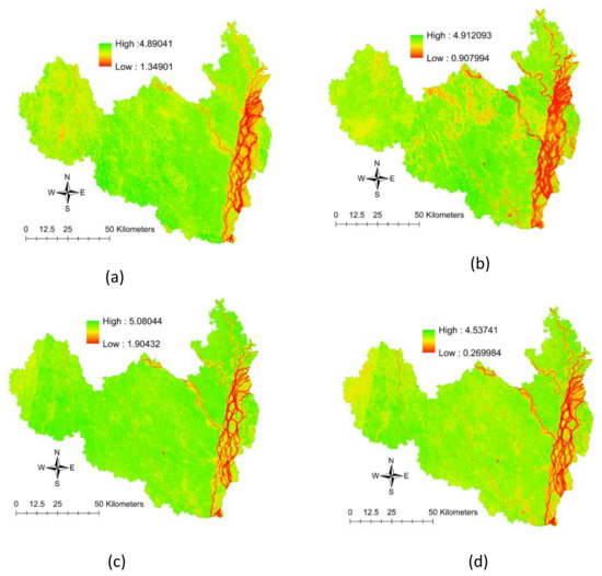 The LST (Figure 3c) was calculated for selected land areas using temporal information from Landsat 8 OLI images when less cloud coverage was present [29]. From 2017–2020, the LST data received from the obtained images ranged between 17 °C and 33 °C. The LST calculation was based on the moving average method. A single raster was formed from multiple years of raster datasets as the multiple predictions’ raster.