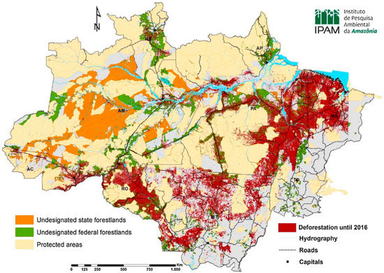 - Azevedo-Ramos, C.; Moutinho, P. No man’s land in the Brazilian Amazon: Could undesignated public forests slow Amazon deforestation? Land Use Policy 2018, 73, 125–127. [Google Scholar] [CrossRef]