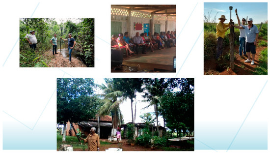 To implement this theoretical approach, different test cases were carried out using GNSS receptors (Global Navigation Satellite System) from Trimble® R1 and R2, which are usually simpler than those used to georeference properties; in exchange, it has been used as an accessible and affordable technology, with adequate accuracy for mapping rural plots. The usage of this simple technology by the local population can be seen in Figure 4.