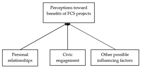 Referring to the existing research which identified an association between social capital and perceptions [,,,,,,,,,,,,], we in our study hypothesize that personal relationships and civic engagement as social capital elements are associated with rural households’ perceptions toward benefits of FCS projects. There are two major reasons why we choose personal relationships and civic engagement as social capital elements used in our study: (i) the first reason has been addressed in the above text which states that many studies of rural households use personal relationships and civic engagement as social capital representations; (ii) the other reason is that the survey design predominantly includes questions relating to household-level factors as we intend to collect the household-level data, which inevitably neglects community-level elements in terms of the representation of social capital. More specifically, we speculate that households having good interpersonal relationships and active civic engagement tend to have positive perceptions toward benefits of FCS projects. For instance, households who get along well with neighborhoods and village officials are more likely to be optimistic toward their lives, and thus are more likely to have positive perceptions toward benefits of FCS projects. Likewise, households actively involved in village-level public affairs tend to gain more comprehensive knowledge about the FCS projects and consequently more likely develop positive perceptions toward the projects. As such, we theoretically claim that social capital is positively associated with households’ perceptions toward benefits of FCS projects, which will further be confirmed through empirical examination by our study. In addition to social capital elements, some other possible factors may also influence households’ perceptions toward benefits of FCS projects, such as age [,,], gender and educational attainment [,,,,,], power, and geographic locations. These possible influencing factors were identified either by literature overview or through focus group discussions with local households, which will be further discussed in the variables section. As discussed, a chart is presented to showcase the influencing factors of households’ perceptions toward benefits of FCS projects (Figure 1).
