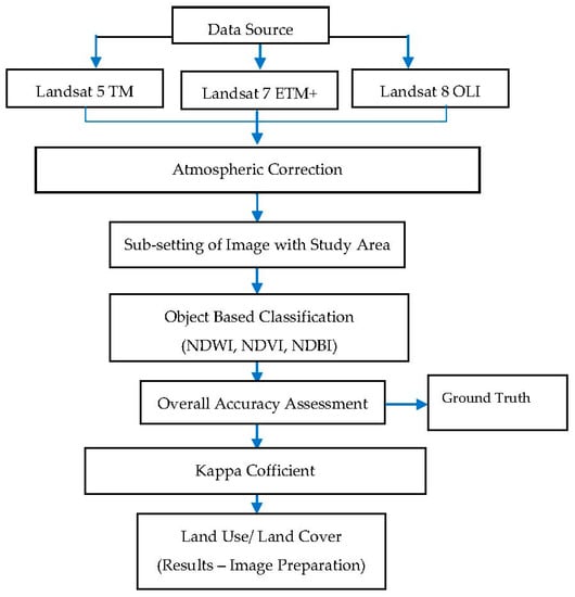 Satellite data was obtained by the website (www.earthexplorer.usgs.gov) owned by USGS. It provides data free of cost. TIR imagery of Landsat 5, Landsat 7 ETM+ and Landsat 8 (OLI) with path 150, row 36 was collected. Object-based classification was applied on the subset of study excluding TIR band using ERDAS Imagine including layer staking. ENVI-2014 Software was used for pre-processing. Band combination of 7-2-1, 4-3-2 and 1-4-5 were used to detect urban, vegetation and water zones in object-based classification in the study area from 1990–2016 with the interval of five years length. Resolutions of the images was 30 m. Complete details of the various images are depicted in Table 1, details of constant values for LST is given in Table 2 and processes of methodology till final output of maps are shown in a flow chart at Figure 2. However, numerical outputs of different indices are shown in Table 3.