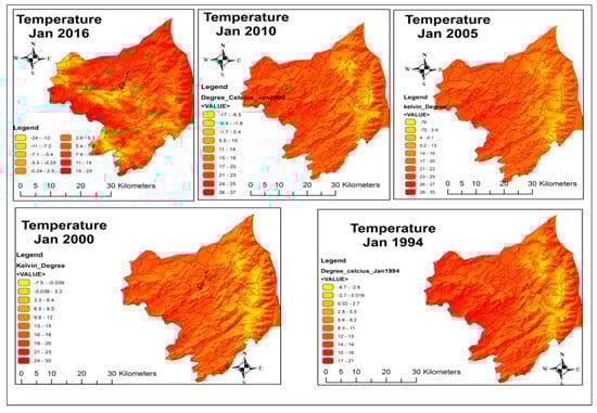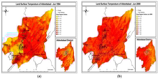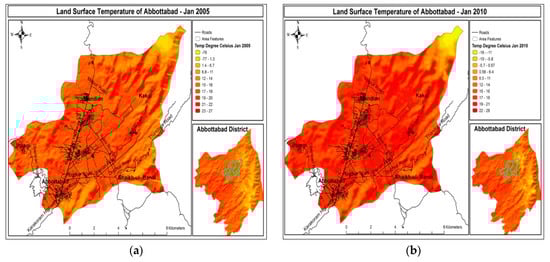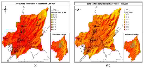 LST means surface temperature on the ground or surface of the earth. This surface temperature is not easily measured and observed with naked eyes [30]. However, this surface temperature is very much measurable through various new technologies of satellites have thermal recording sensors [31]. Figure 7a showing temperature of 1990–1994 and Figure 7b depicts temperature of 1995–2000 for the months of Jan. City center is showing high temperature because of concrete surfaces. Minimum LST of Abbottabad from Jan 1995–2000 is shown that it was increased from 3 °C to 5.8 °C. In Figure 7a the temperature of Abbottabad has risen up to 20 °C. A glaring change is very much pertinent to perceptible interpretation held in the figure. In the map all three Union Councils have different temperature values from 25 °C to 26 °C.